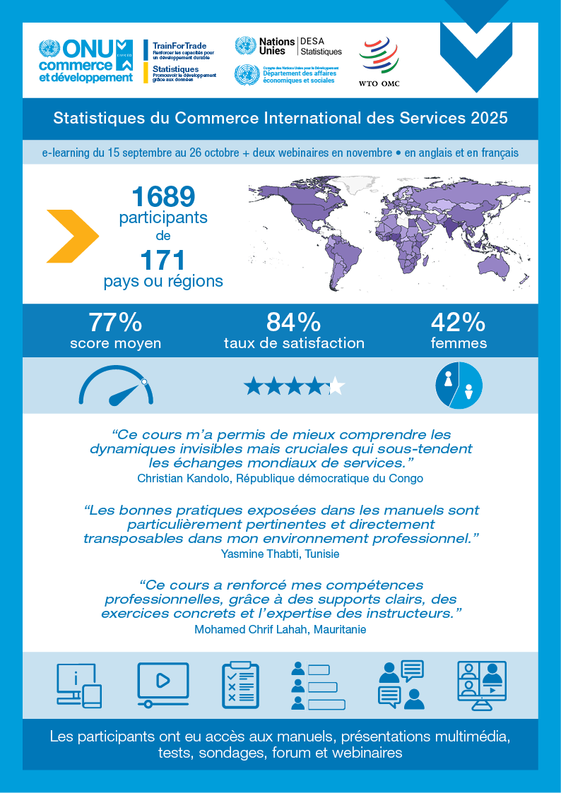 L’objectif de ce cours est de sensibiliser le public aux statistiques liés au commerce des services et à ces concepts, d’accroître les performances des équipes en charge des statistiques au niveau national et leur permettre de mieux comprendre le manuel des Statistiques sur les échanges internationaux de services (MSITS 2010 – Manual of Statistics on International Trade in Services).